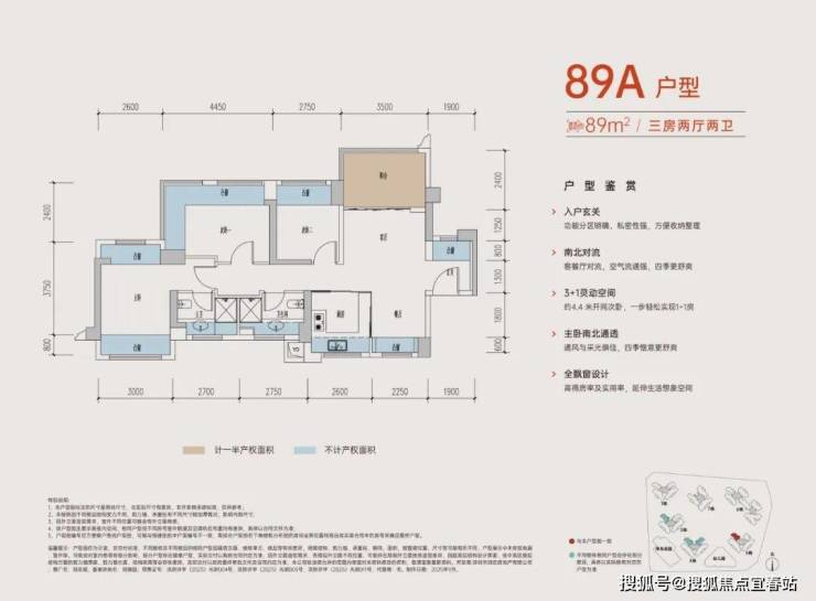 89㎡的3+1房2厅2卫,A户型,设计的是竖厅南北通透格局,进门入户玄关,客厅3.5米开间,客餐厅分离设计,五开间朝南,主卧南北通透双飘窗,分别做到了主卧15.73㎡/次卧14.08㎡/次卧8.96㎡(包含墙体飘窗),U型厨房,卫生间干湿分离,得房率约:77.3-77.39%(不含赠送),阳台主朝东北向。这次推出最靓的户型可以改4房,赠送面积24.5㎡,加上赠送得房率高达104.87%。