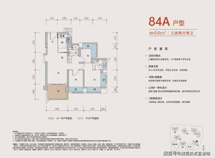 84㎡的3房2厅2卫,设计的是经典竖厅格局,进门入户玄关,客厅3.4米开间,LDKB一体化,S墙设计预留冰箱位,动静分区,分别做到了主卧13.5㎡/次卧8.75㎡/次卧8.6㎡(包含墙体飘窗),U型厨房,公卫三段式干湿分离,得房率约:77.2%(不含赠送),东北朝向。