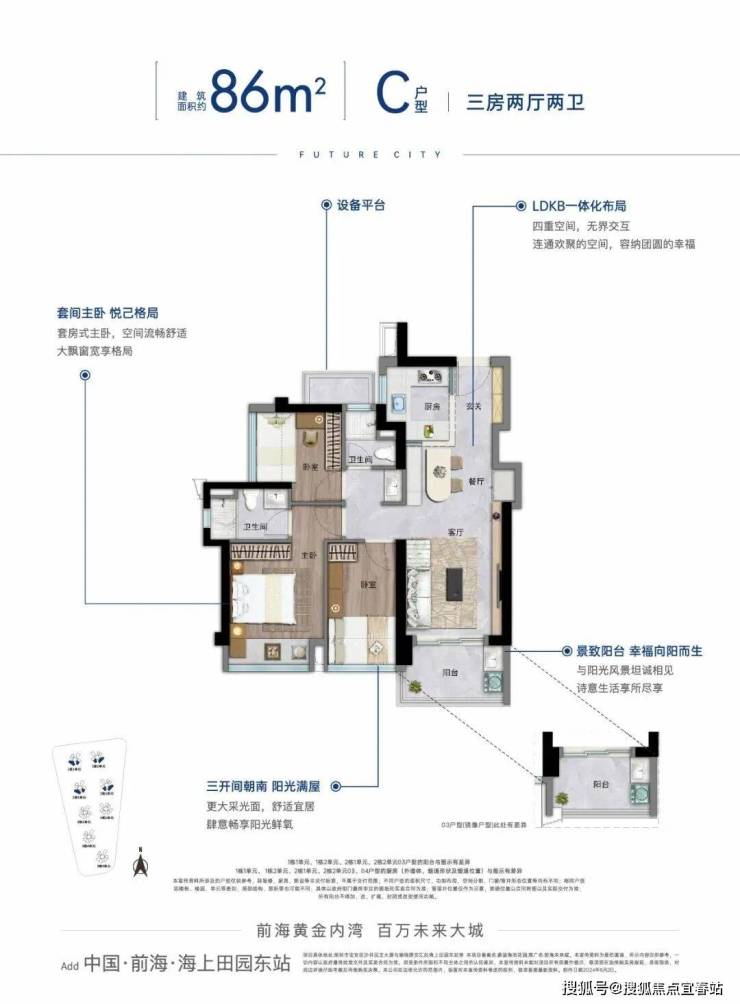 86㎡3房2卫:总价313-324万/套,单价3.6-3.7万/㎡;