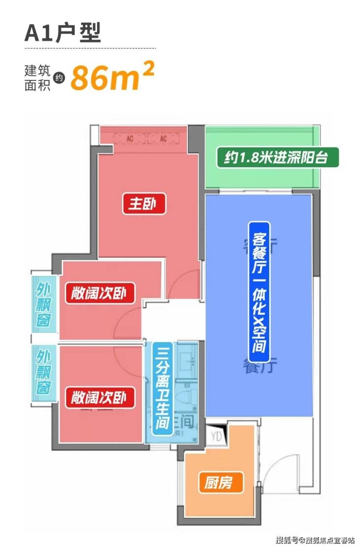 建面约86㎡3房2厅1卫户型,标准大三房的格局,非常适合首置的购房者,整个空间兼具实用性与舒适性。