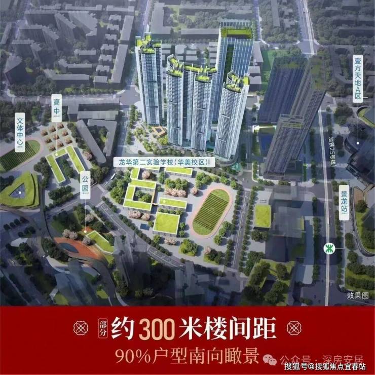 该项目一路之隔即是鸿荣源壹方天地购物中心,家门口龙华第二实验学校华美校区+4/25号地铁线双站点。