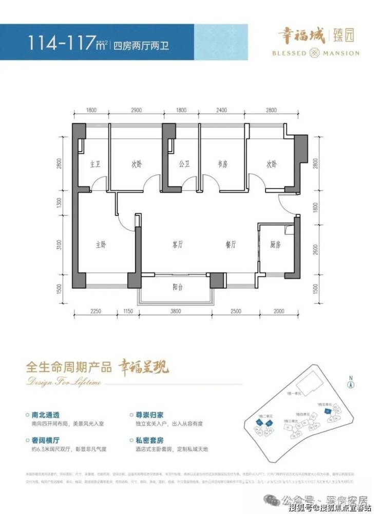 114-117㎡的4房2厅2卫,设计的是横厅南北通透格局,进门入户玄关,客餐厅6.3米开间,LDKB一体化设计,全屋8个飘窗面,4个卧室分别做到了主卧15.35㎡/次卧9.86㎡/次卧9.4㎡/次卧8.16㎡(包含墙体飘窗),U型厨房,卫生间干湿分离,得房率约84.87-87.1%(包含赠送),阳台主朝西南或东南向。