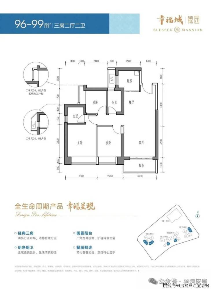 96-99㎡的3房2厅2卫,设计的是经典竖厅格局,客厅3.5米开间,LDKB一体化设计,动静分区,3个卧室分别做到了主卧14.63㎡/次卧11.07㎡/次卧7.26㎡(包含墙体飘窗),U型厨房,卫生间干湿分离,得房率约81-84%(包含赠送),东南/西南或东北朝向。