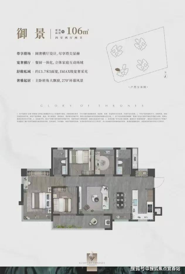 设计的是横厅南北通透格局,客餐厅开间5.6米,餐厨一体化,约13.7米超幕视野,超长阳台,主卧转角270°大飘窗,只有2栋07户型才有,得房率:78.99%(不含赠送),阳台主朝西南向。