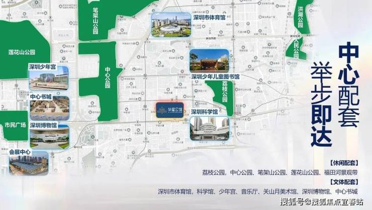 文体配套:深圳市体育馆,科学馆、少年宫、音乐厅、关山月美术馆、深圳博物馆、中心书城
