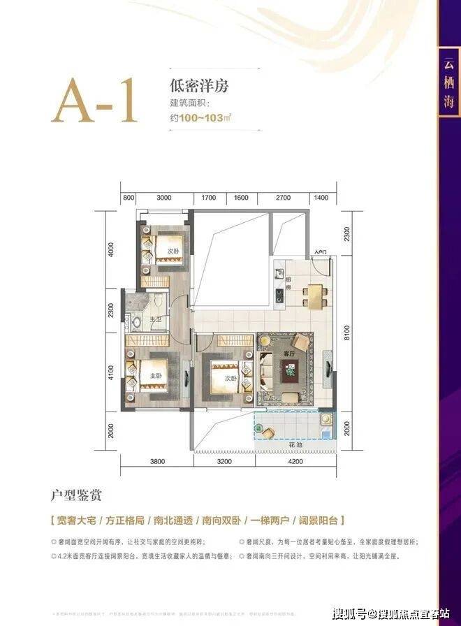 一梯两户,南北通透,阳光清风入户无拘束;双卧室朝南设计,4.2米面宽客厅连接阔景阳台,三面阳光环绕,生活乐趣自由延伸。