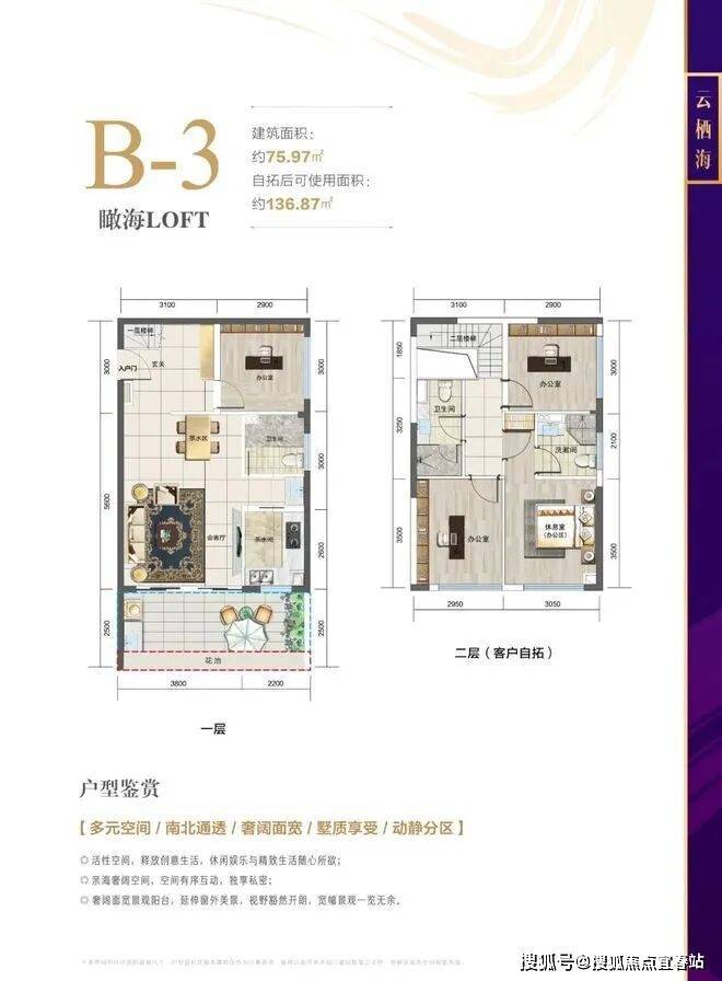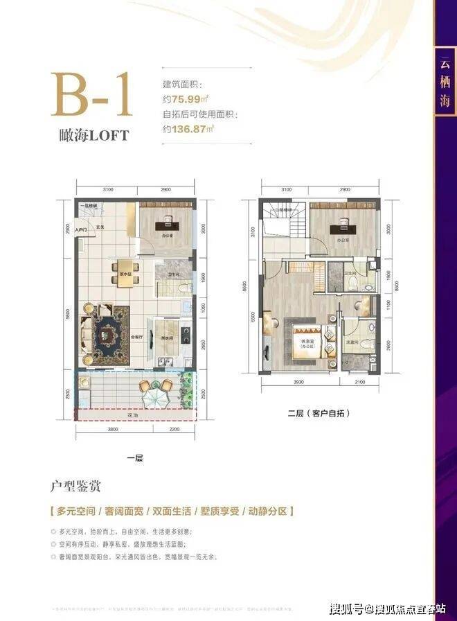一层繁花,一层繁华;一层价格,两层空间享受。阔绰层高筑就活性多面空间,生活随心所欲;悦享4.2米宽阔景观阳台,室内与自然融为一体,尽享滨海生活美学。