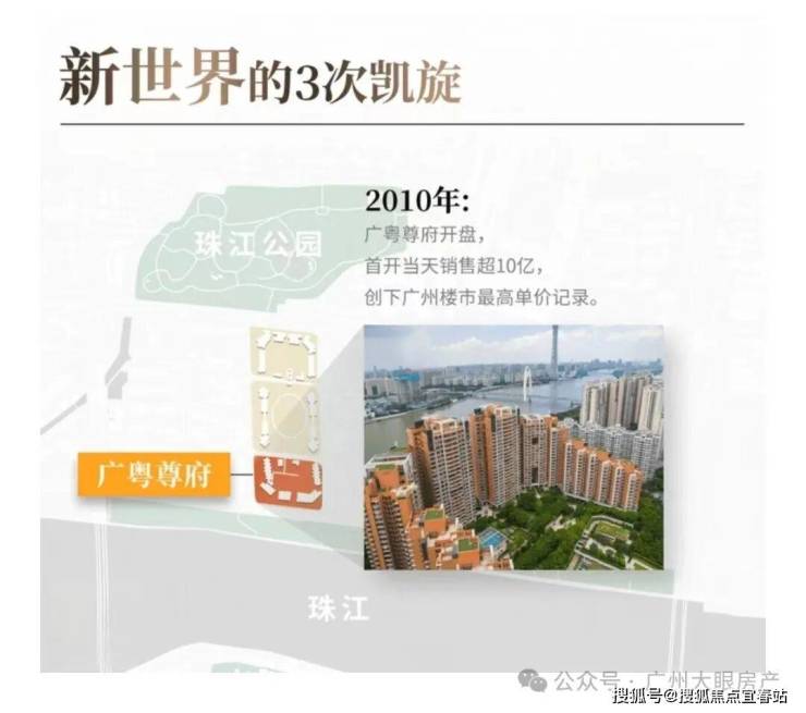 2010年,凯旋新世界广粤尊府首开,当天销售超10亿,一举创下广州楼市的最高单价记录。也正是这一年,广州楼价达到历史巅峰,涨幅为38%。