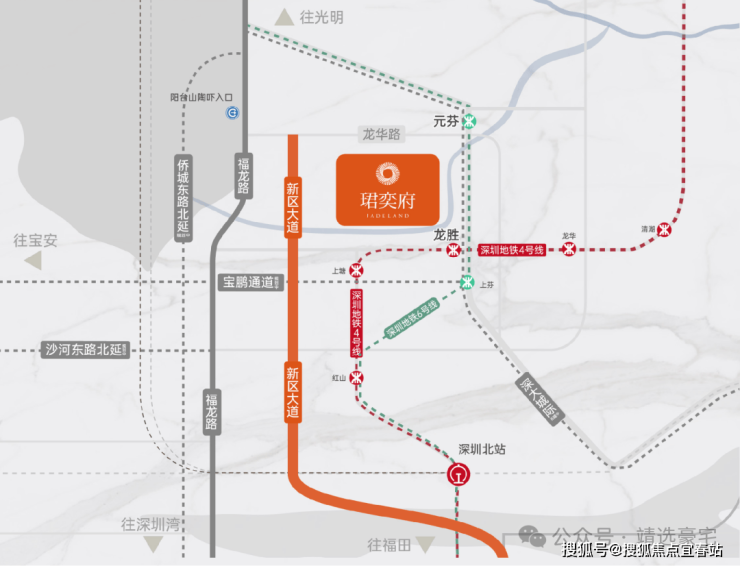 地铁:约500米4号线龙胜站,约800米6号线元芬站,3站深圳北, 5站福田;