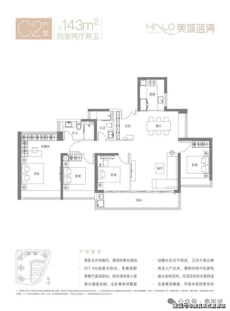 143㎡的4房2厅2卫,C1户型,竖厅南北通透格局,客厅4.2米开间,五开间朝南,客厅连接次卧出7.2米长的巨幕大阳台,U型厨房,卫生间干湿分离,得房率约77.13%(不含赠送),阳台主朝正南向。