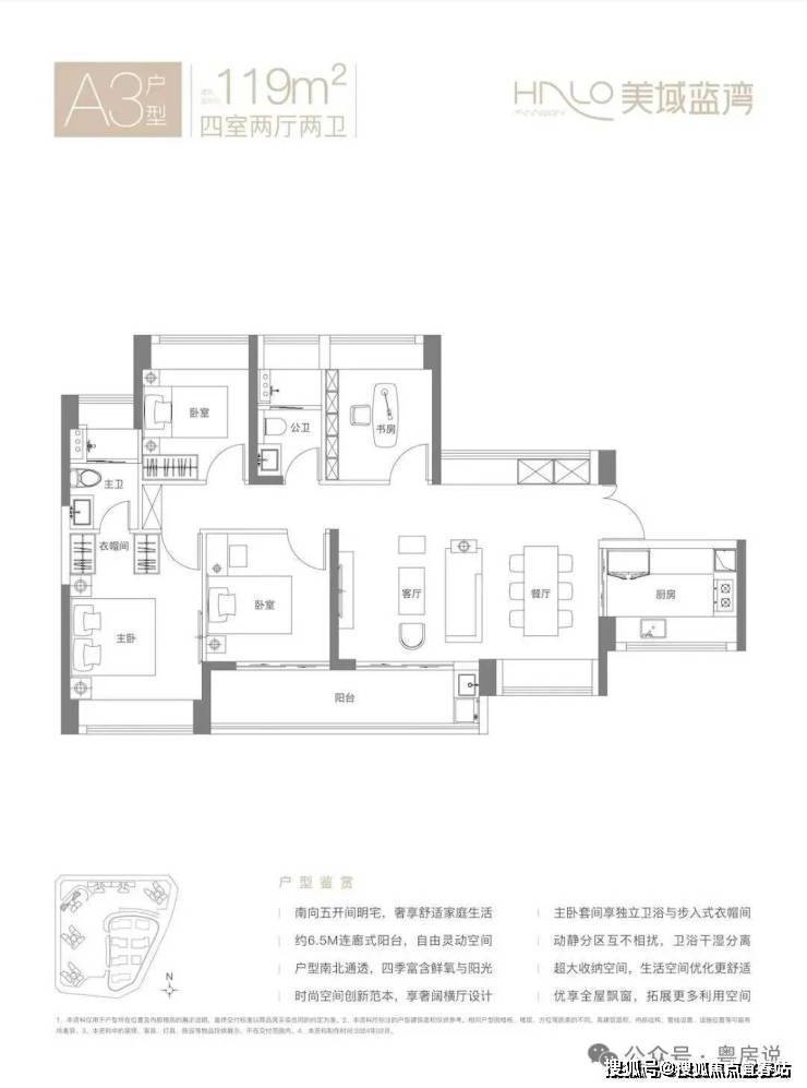 119㎡的4房2厅2卫,A3户型,横厅南北通透格局,客餐厅6.3米开间,LDKB一体化设计,五开间朝南,U型厨房,卫生间干湿分离,客厅连接次卧出6.5米长的观景大阳台约9.75m²,阳台主朝东南向,得房率约75.3%(不含赠送),加上赠送得房率90.48%。