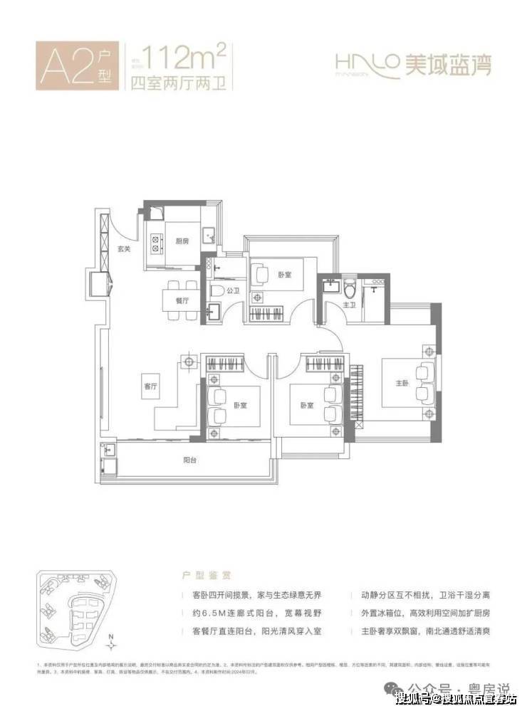 112㎡的4房2厅2卫,A2户型,竖厅南北通透格局,客厅3.9米开间,LDKB一体化设计,S墙设计预留冰箱卡槽位,动静分区,客厅连接次卧出6.5米长的大阳台,U型厨房,卫生间干湿分离,得房率约80.12%(不含赠送),西南或东北朝向。