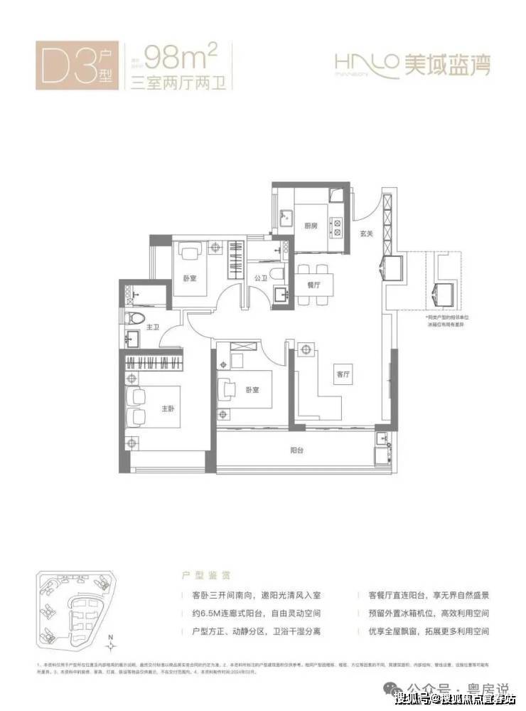 98㎡的3房2厅2卫,D3户型,经典竖厅格局,客厅3.7米开间,LDKB一体化设计,S墙设计预留冰箱卡槽位,动静分区,客厅连接次卧出6.5米长的大阳台,U型厨房,卫生间干湿分离,得房率约80.12%(不含赠送),东南朝向。