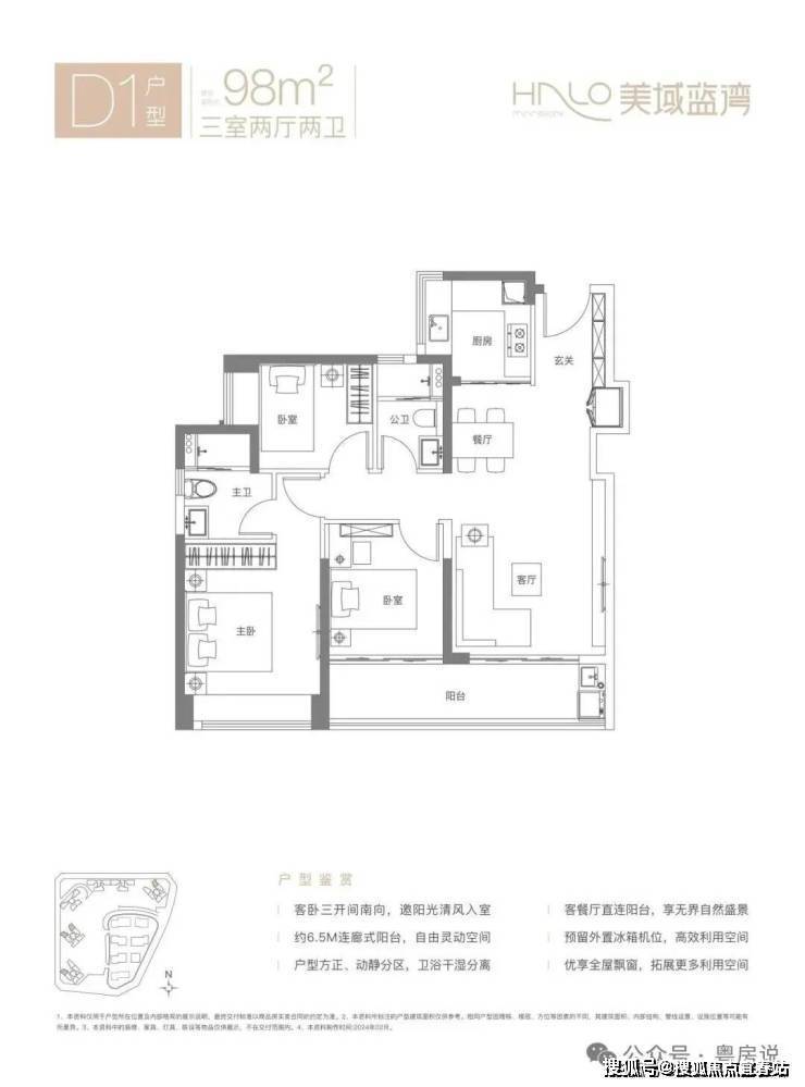 98㎡的3房2厅2卫,D1户型,经典竖厅格局,客厅3.7米开间,LDKB一体化设计,S墙设计预留冰箱卡槽位,动静分区,客厅连接次卧出6.5米长的大阳台,U型厨房,卫生间干湿分离,得房率约80.12%(不含赠送),西南或东北朝向。