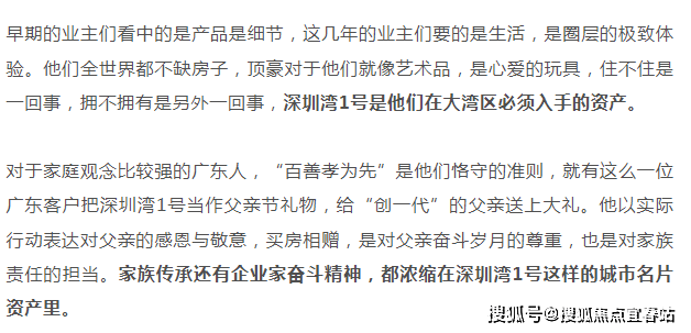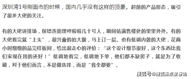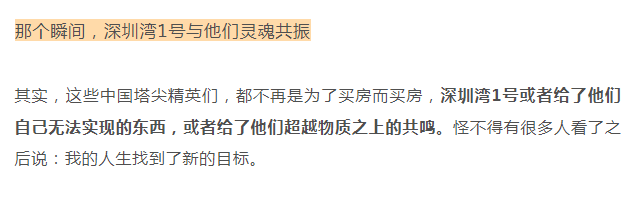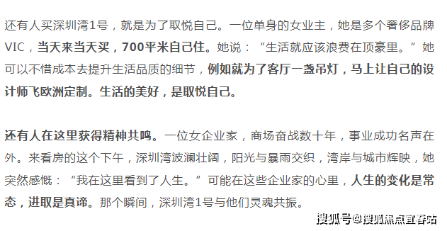 深圳湾1号让精英们趋之若鹜的原因,是“懂得赚有钱人的钱”。就像上面那位“中国巴菲特”形容的,财务自由了,遇到触动灵魂的东西,绝不能错过,绝不能留遗憾。