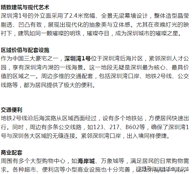 深圳湾1号不仅是一座豪宅,更是居住者身份与品味的象征。这里融合了顶级地段、尊享服务与卓越配套,成就了无数人心中的理想家园。深圳湾1号,不仅让您拥有一个家,更为您提供了一个尊贵、奢华、无与伦比的生活方式。
