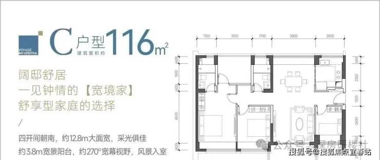 116㎡的4房2厅2卫,C户型,设计的是竖厅南北通透格局,餐客厅一体化设计,客厅3.8米开间,四开间朝南,4个卧室分别做到了主卧17.85㎡/次卧11.4㎡/次卧9.3㎡/次卧8㎡(包含墙体飘窗),都不用搭配飘窗做床,U型厨房,卫生间干湿分离,得房率约:93.13%(包含赠送),阳台主朝西南、东南或正南向。
