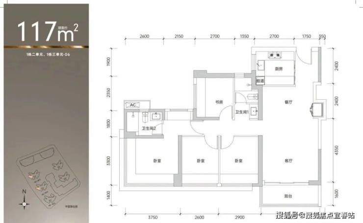 117㎡的4房2厅2卫,1栋2/3单元06户型,设计的是经典竖厅格局,客厅4米开间,四开间朝南,动静分区,4个卧室分别做到了主卧16.5㎡/次卧9.57㎡/次卧8.58㎡/次卧7.97㎡(包含墙体飘窗),得房率约90%(包含赠送),东南或西南朝向。