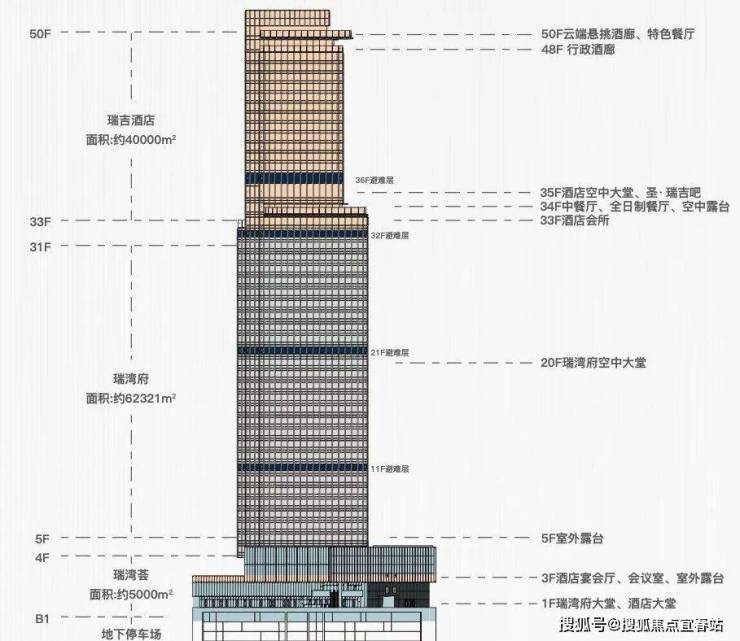 项目33-50F为瑞吉酒店,5-31F瑞湾府目前在售190-360㎡酒店式行政公馆,层高4.4米。