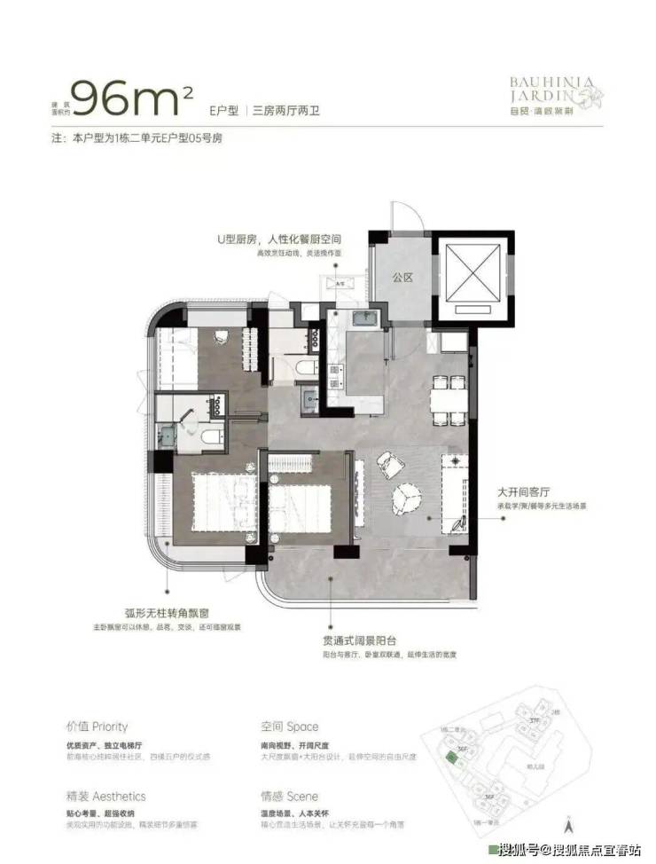 96㎡三房两厅两卫:西南向视野,U型厨房设计,大开间客厅与宽阳台联通,贯通式阔景阳台与客厅、卧室双通,主卧带弧形无柱转角飘窗。