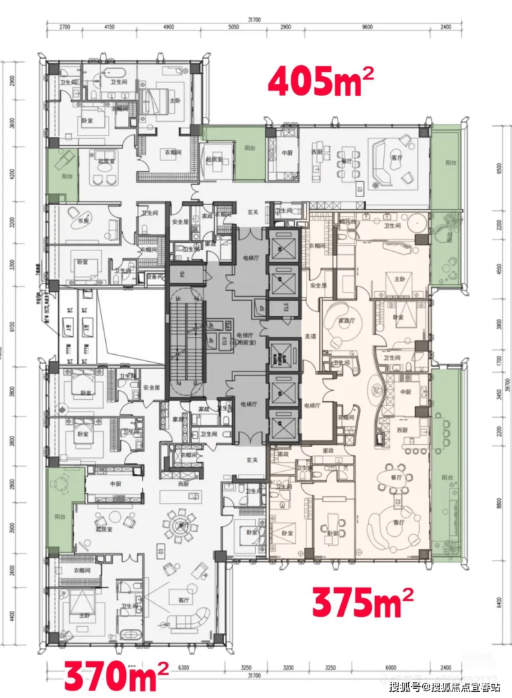 高区(150-200米):370-403㎡“4+1房”,增加家庭厅、家政套间等,强化多功能性与舒适性。