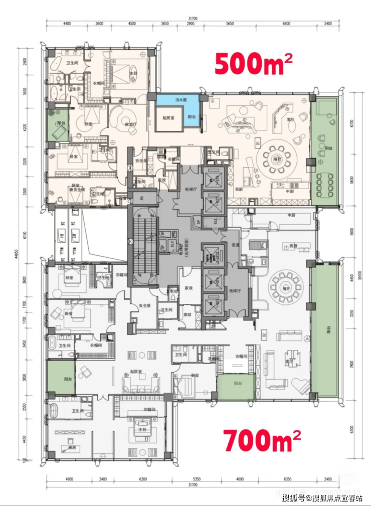 超高区(200米以上)及顶楼:500-1050㎡顶级大平层,提供总统级居住体验,如独立电梯厅、双主卧套房、270°观景客厅等。