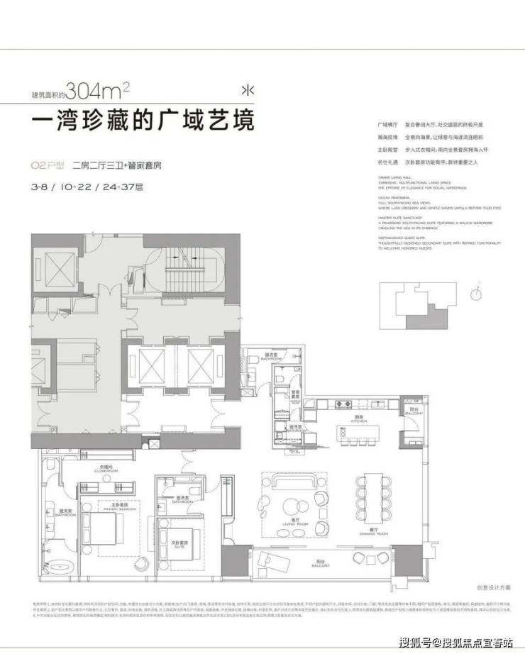 304㎡做2房3卫+家政套间,327㎡做3房4卫+家政套间,402㎡做4房4卫+家政套间,568㎡4+1房五卫+家政套间,1032㎡大平层。