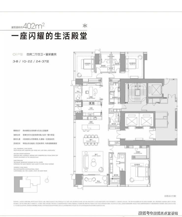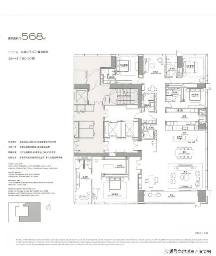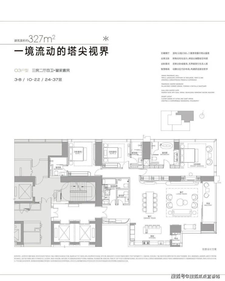 ● 公寓主力户型:304㎡(2 房)、327㎡(3 房)、402㎡(4 房)、568㎡(4+1 房) 和 1032㎡(顶层)