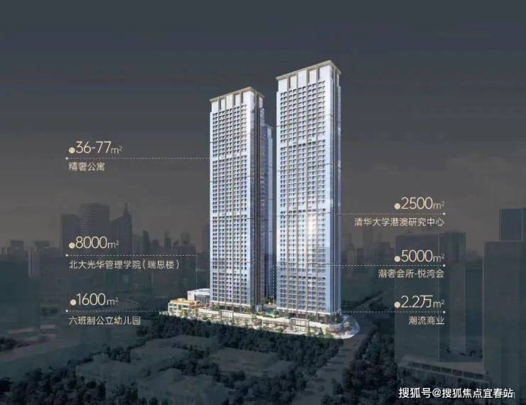 恒裕柏悦湾由2栋47层高公寓与2栋42层商办组成项目自带·约2.2万㎡潮流商业·约5000㎡精英会所·约8000㎡北大光华管理学院(北大光华瑞思楼)·约2500㎡清华大学港澳研究中心·约1600㎡六班制公立幼儿园共同组成约37万㎡垂直综合体——200米深湾超级地标