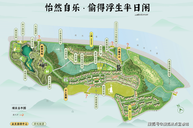 项目分为四个区域:田园综合示范区、亲水生态度假区、田园生活休闲区、森林山地康养区。