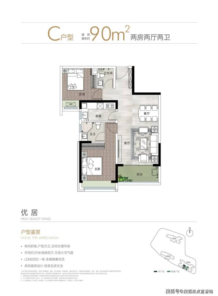 主力户型为建面约90/110㎡的A/B户型,全系采用全尺寸飘窗/转角飘窗和大阳台配置,充分发挥景观优势。