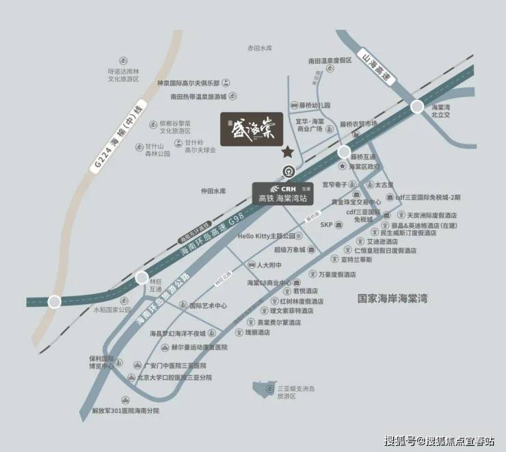 交通超便利,距离三亚市中心约 28km 、海棠湾高铁站(规划中)约 2km 、三亚凤凰国际机场约 35km 。周围商业氛围浓厚,CDF 免税城、河心岛、太古里、SKP、超级万象城等旗舰商业云集 。医疗资源也很优质,北大口腔医院三亚医院、301 解放军总医院海南医院为健康保驾护航 。教育资源同样不逊色,人大附中、美国卫斯理安国际学校等构建起 12 年一站式教育体系 。这里还是旅居胜地,汇集 32 家顶奢五星级酒店,亚特兰蒂斯水世界、蜈支洲岛等旅游地标都在附近 。而且周边生态资源丰富,甘什山岭、槟榔谷、南田温泉、神泉国际高尔夫俱乐部相伴,妥妥的自然栖所。