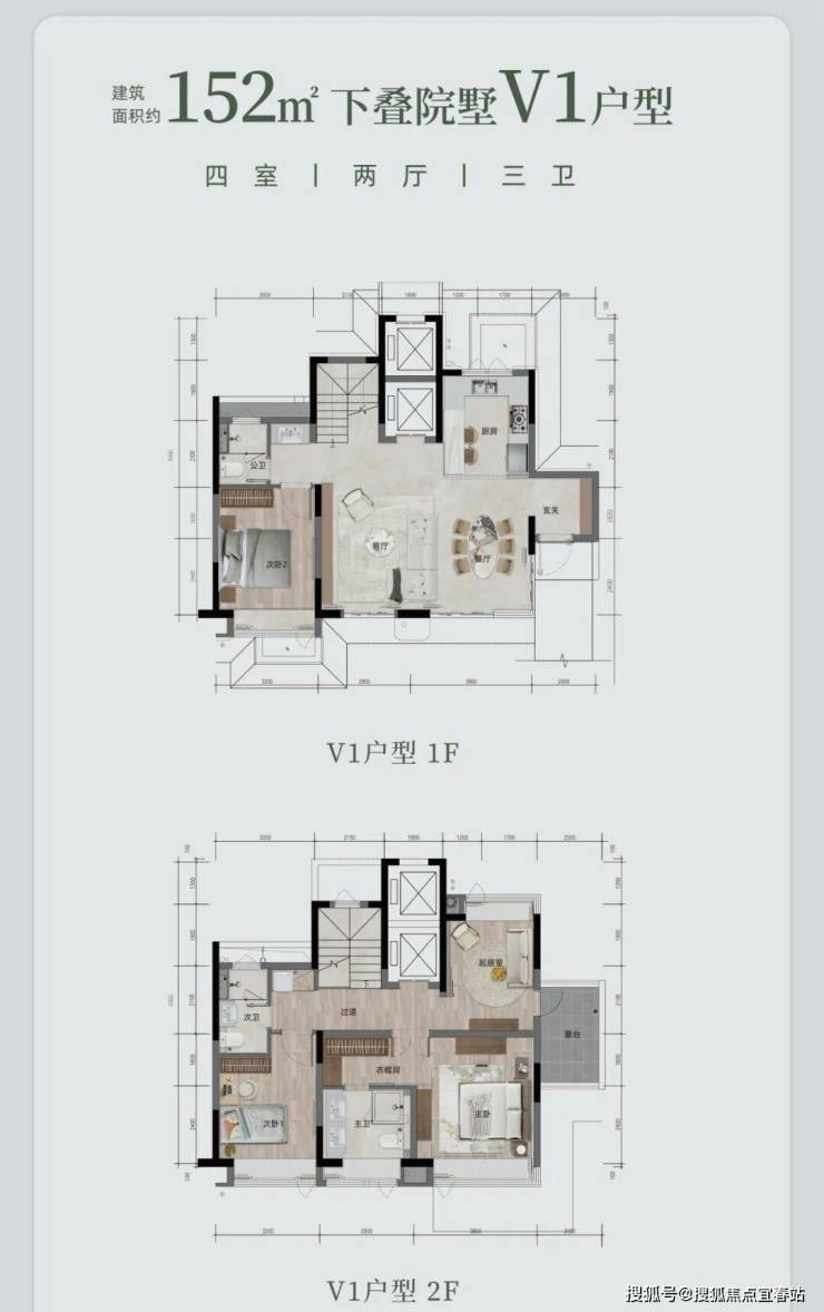 下叠院墅 V1 户型,约 152㎡(或 151.4㎡ ),四室两厅三卫。配备私人电梯、双重玄关入户,从地下车库可直达。约 6.7 米奢阔度假横厅,约 40㎡会客空间 。还有私家花园露台,主卧是酒店行政套房式设计,还有多重可拓展空间。