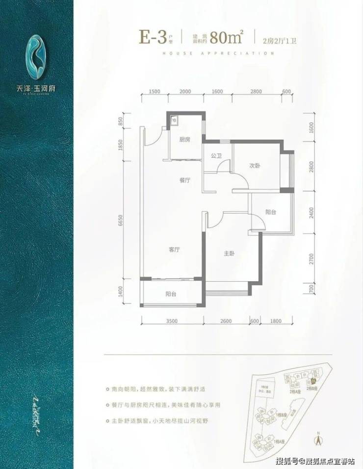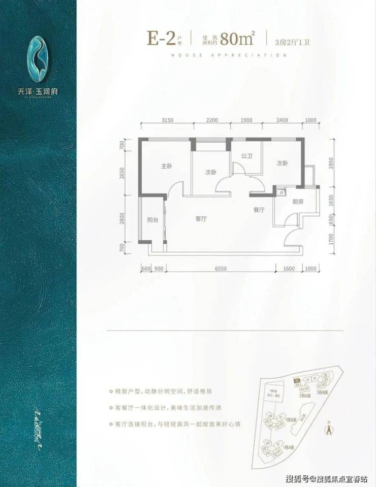 E2户型-80㎡-3房2厅1卫,2栋A座05户型,设计的是竖厅格局,客厅3.5米开间,餐客厅一体化,3个房间宽度分别为3.15/2.4/2.2米,L型厨房,得房率:83.7%(包含赠送),阳台进深1.5米,朝西南向。