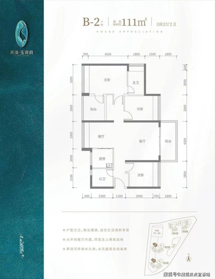 B2户型-111㎡-4房2厅2卫,设计的是竖厅南北通透格局,客厅4.2米开间,阳台主朝东北朝向,看花园景观,全屋飘窗设计。