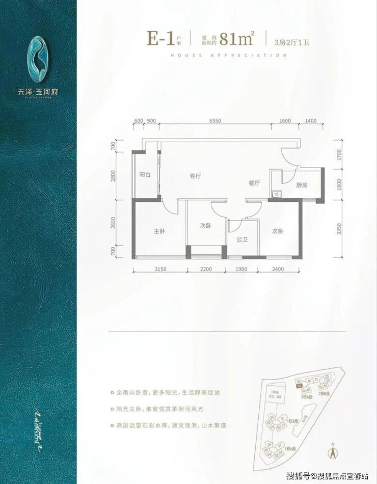 E1户型-80㎡-3房2厅1卫,2栋A座04户型,设计的是竖厅格局,客厅3.5米开间,餐客厅一体化,3个房间宽度分别为3.15/2.4/2.2米,除了厨房跟E2户型有点差异,其它格局都是一样的,得房率:84.3%(包含赠送),阳台进深1.5米,朝西南向。