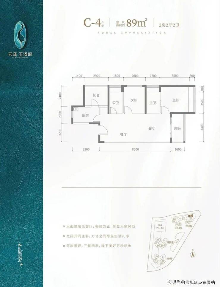 C2户型-89㎡-3房2厅2卫,2栋A座02/03,2栋B座02户型,设计的是竖厅格局,客厅3.5米开间,3个房间宽度分别为3/2.8/2.6米,公卫三段式分离,得房率:90.9%(包含赠送),阳台进深1.5米,东南朝向,看茅洲河景观。
