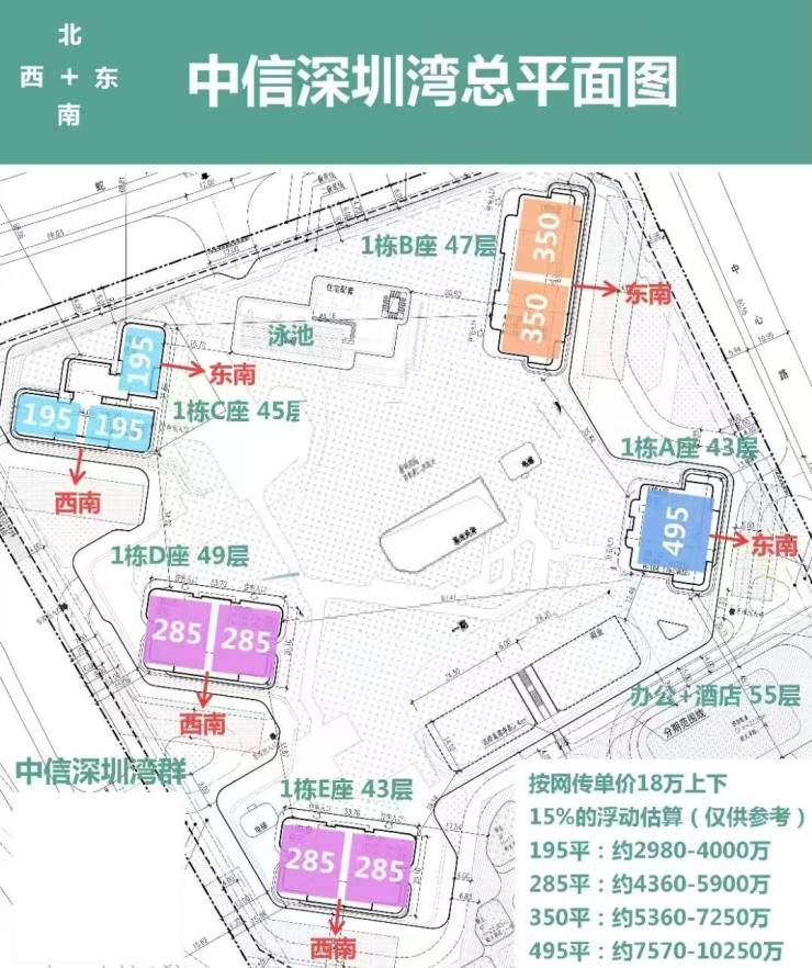 从规自局南山管理局发布的总平面图来看,元湾府(一期)总建筑面积207205㎡,住宅建筑面积约125644㎡,将建5栋超40层的高层住宅,最高一栋为西北侧1栋C座,将达到54层的高度。