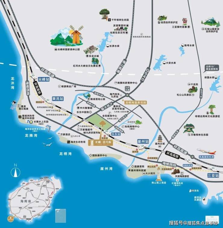 九所占据三亚西核心C位,四大湾区环绕,海陆空多维立体交通;本案距三亚国际机场60km,乐东覆盖尖峰、黄流、乐东3大高铁站,其中乐东站依偎在旁,出行方便;