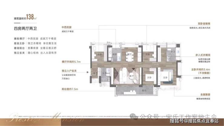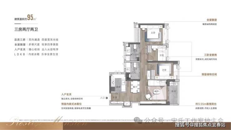 大阳台,餐客厅一体化,玄关进来不对着客厅和主卧门,优化了横厅风水对冲问题,无论是横厅还是竖厅得房率都做到了82%,综合使用率高达89%。