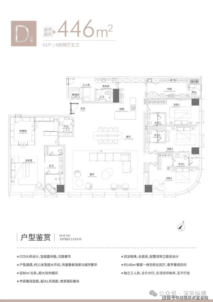 荟萃CCD、柏朗国际两大设计团队联袂匠造,以国际化视野,精研侨城湾芯云端新作,仅28席,位于建筑23-29层,全高区景观视野,建面约323-446㎡,纯粹大户云端居所。4款室内设计风格独特,尺度阔绰,兼顾细致实用,畅享舒适空间。
