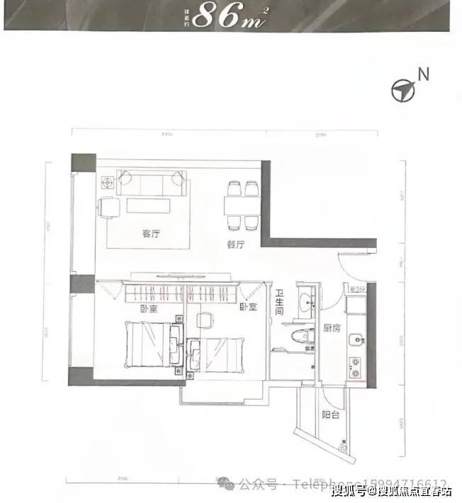 建面约86㎡大两房:空间布局合理,采光充足,适合小家庭或单身贵族居住。