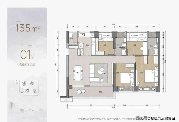 135㎡ 四房户型,1056-1118万