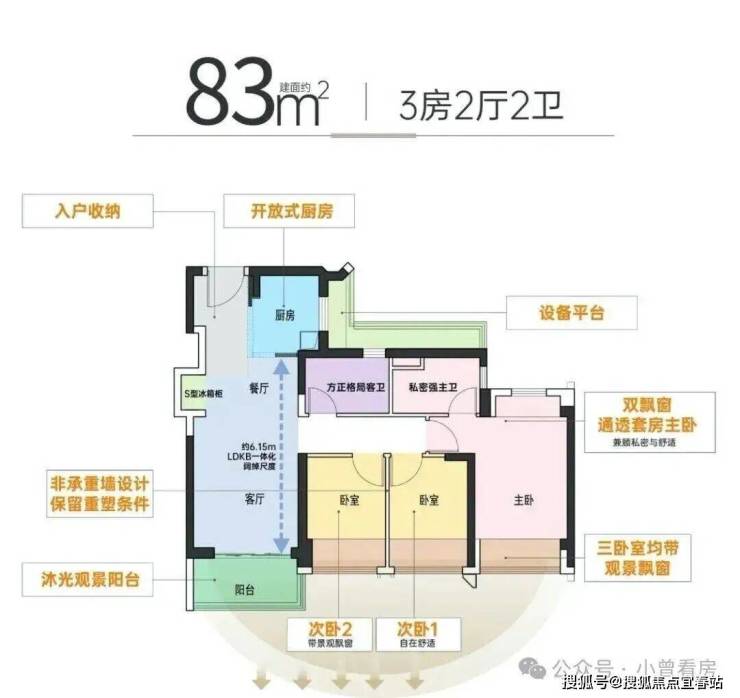 85平米三房两卫:设计的是竖厅格局,客厅3.2米开间,三开间朝南,3个卧室分别做到了主卧16.41㎡/次卧7.71㎡/次卧7.4㎡(包含墙体飘窗),公卫带2㎡的设备平台,得房率约:97%(包含赠送),东南朝向看观澜河景观。