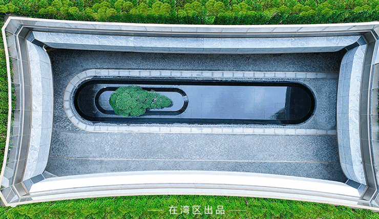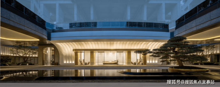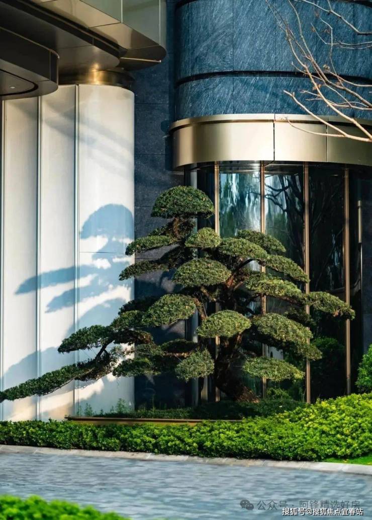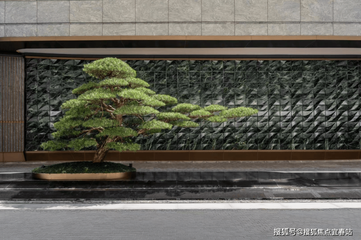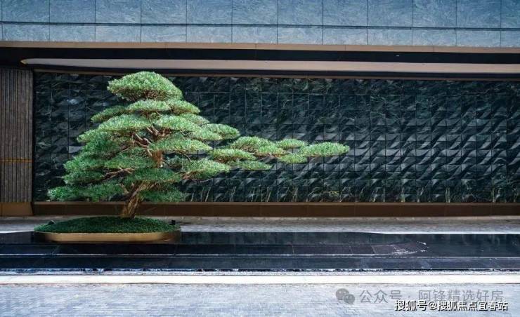 在下沉式庭院中央,一棵约5米高的迎客松巍然矗立,搭配普拉达绿的奢石背景墙,成为引人注目的景观焦点。它不仅是一道独特的风景线,更是岭南建筑特色“四水归堂”理念的重要体现。与无边界的流水相映成趣,营造出松韵、水波、月影交融的意境。罗汉雕塑、水景与玻璃幕墙巧妙融合,在阳光洒落的天井中,与自然展开一场静谧的对话。
