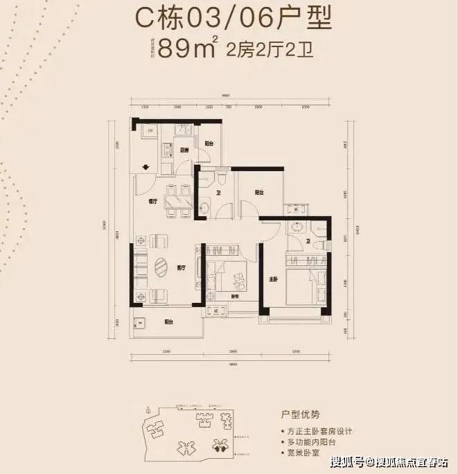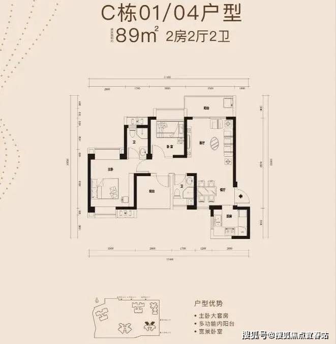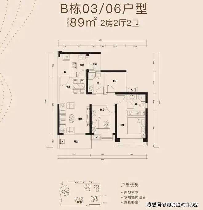 可算是01户型的加强版,通透设计通风采光优秀,客厅朝向西北,横厅布局有利于室内空间充分利用,餐客厅开间7.7米宽敞明亮,1.7米宽大阳台舒适度高视野景观优秀。主卧开间4.8米舒适度良好,但开窗方向景观资源较弱。双套间设计,书房与南向阳台可为两个独立空间也可合并做大房