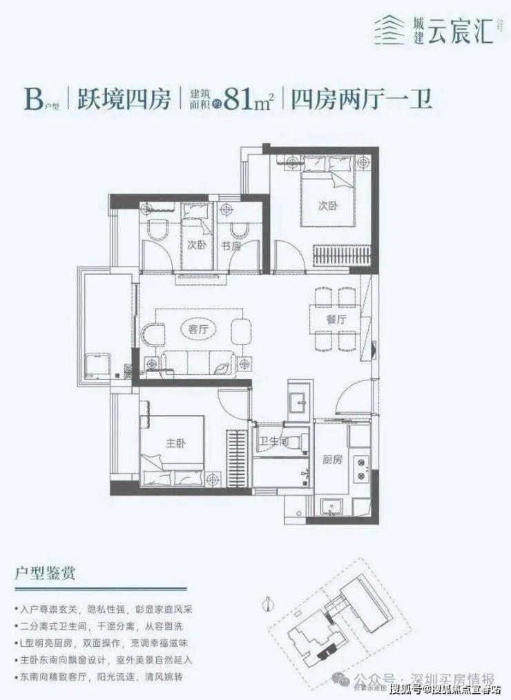 81㎡的4房2厅1卫,设计的双龙抱珠格局,餐客厅一体化,L型厨房,东南朝向,这个面积段能做到4房现在的市面上非常难得。