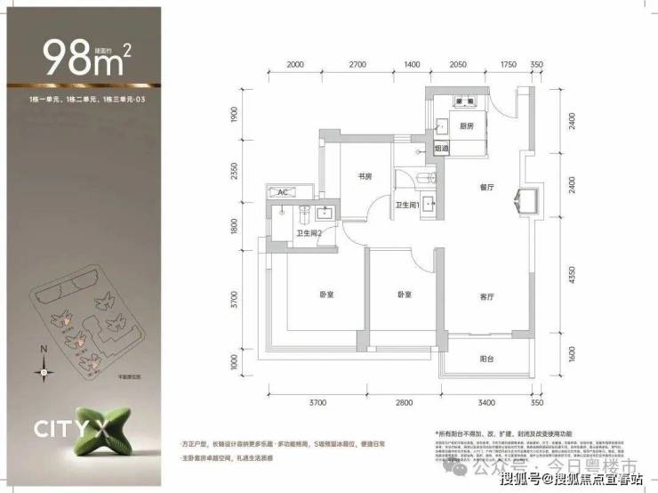 98平户型,竖厅设计,动静分区,满足家庭不同年龄段的居住所需,不管是亲友来访或是父母小住,都有阔绰空间安排。