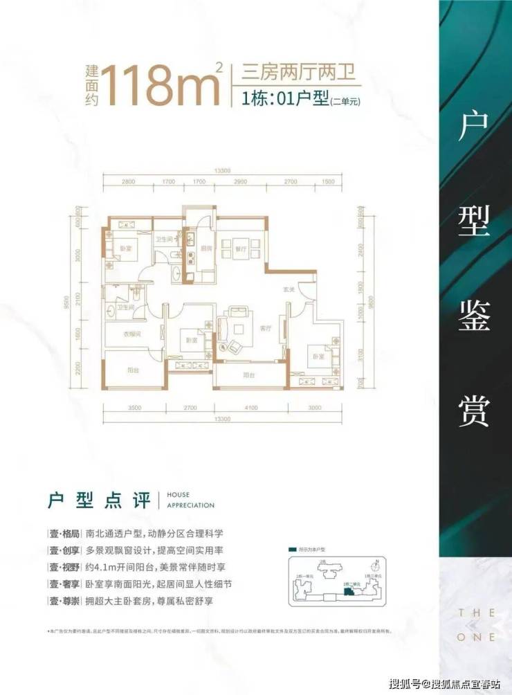 1栋2单元01户型 南向端头通透户型,大开间短进深,主要生活空间南向,光照充足。客厅开间4.1米明亮舒适,主卧南向空间方正实用,次卧空间分配均衡。开间进深比良好,空间利用充分。餐厨空间独立成区,自然通风采光性能*,厨房可向生活阳台扩展。入户玄关有良好的功能空间