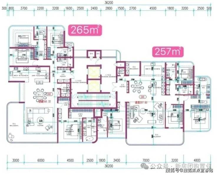 253–332㎡家族平层:2T2板楼设计,独立入户,双主卧套房均带海景卫浴,视野无遮挡,定位为顶奢客群。
